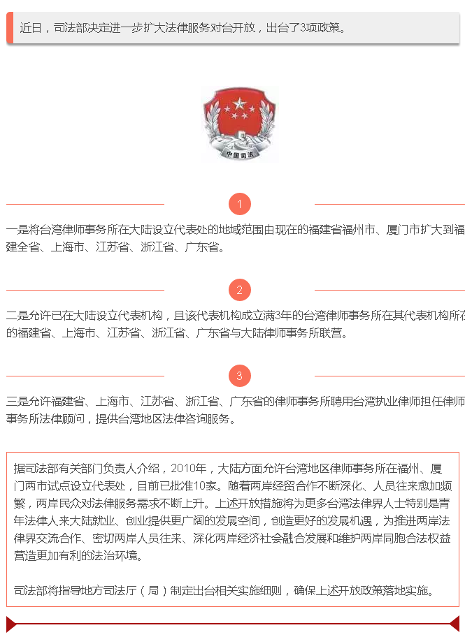 > 【政策】司法部出台3项政策 进一步扩大法律服务对台开放
