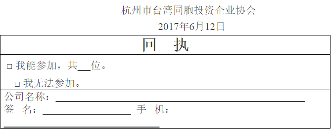 尊敬的各位会员乡亲: 您好!为积极响应国台办“欢迎广大台商参与‘一带一路’建设,共享发展机遇”的工作要求,帮助我会台商全面了解有关“一带一路”相关政策及建设情况,让广大台商分享大陆经济发展的机遇,杭州市台办和我会定于6月22日(周四)下午14:30在市民中心J楼一楼杭州图书馆读者交流区举办“一带一路”政策培训会,并现场答疑。时间为两小时左右。敬请您拨冗参加,并填写本回执,于6月19日(周一)前传真至87161120,或拨打报名电话:87161107,87161109,或微信报名,谢谢!
